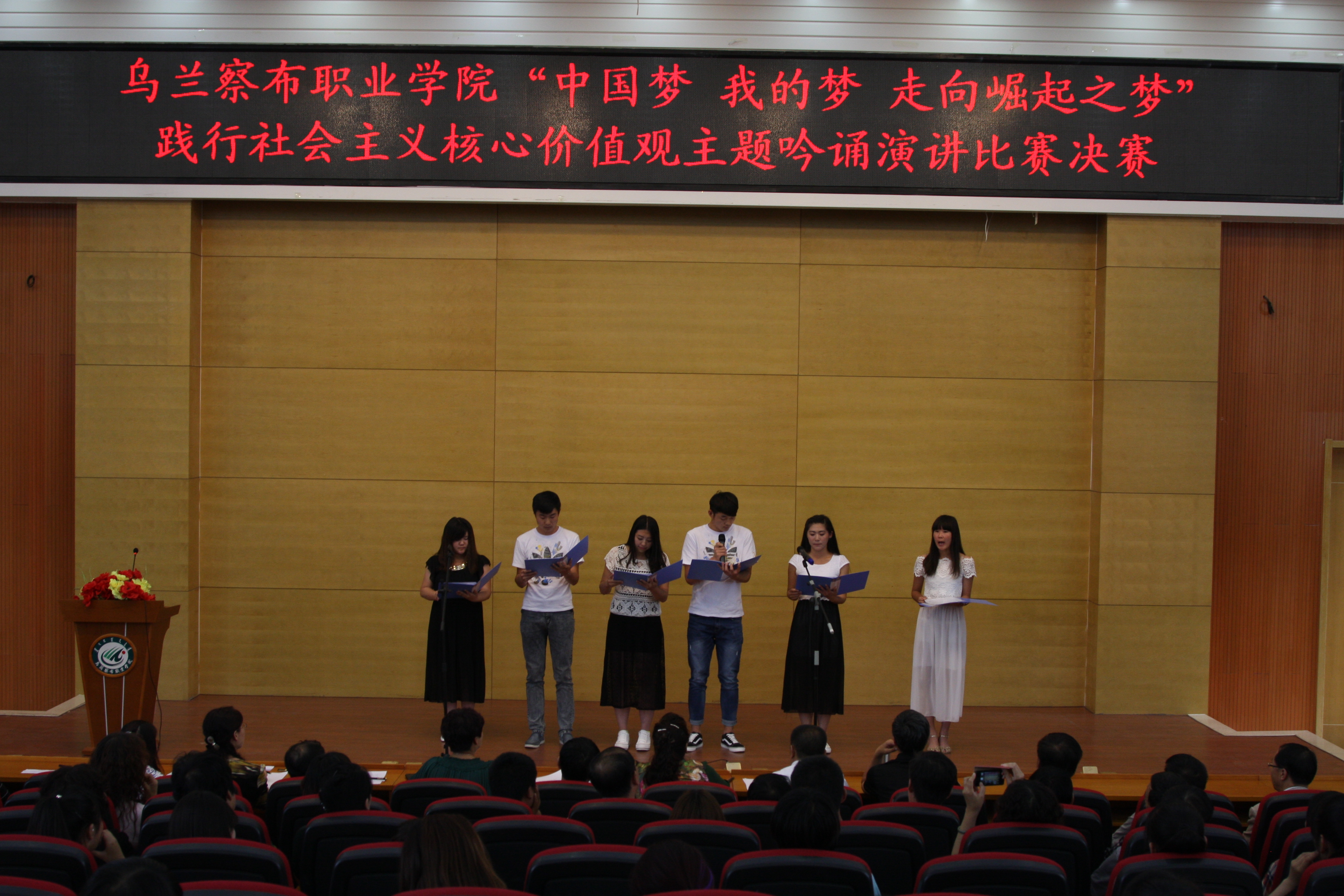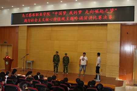 6月24日下午4:30分,学术报告厅,由宣传统战部、院工会、学生学生工作处、团委、关工委、综合能力教学部联合举办的以“中国梦·我的梦·走向崛起之梦”践行社会主义核心价值观为主题的吟诵演讲比赛隆重举行;