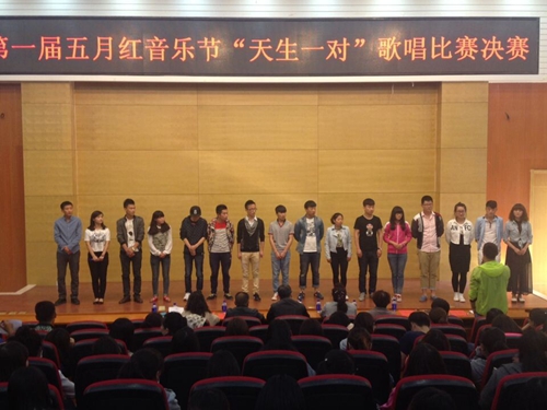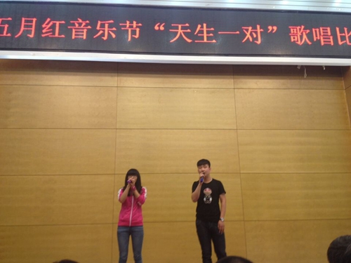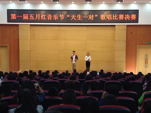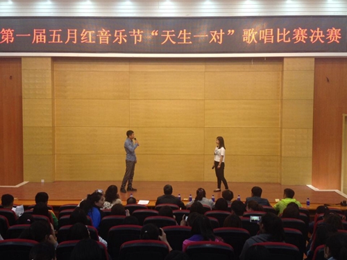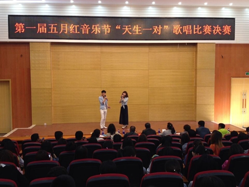 音乐为爱而歌唱,歌唱有你才完美。为激发同学们表演兴趣,为更多喜欢音乐的同学们提供一个展示自己的平台,发挥自己独有的特长。在忙碌的学习之余能丰富同学们的日常生活,培养更多学生的良好竞争意识以及对歌唱艺术的表现与鉴赏能力,学院精心策划了首届五月红“天生一对”的歌唱比赛,比赛以两人对唱的形式,其性别不限。活动不仅让每位表演者展示自己的才华,而且培养了同学之间很好的合作能力。比赛经过严格的初赛筛选,于2014年5月19日在行政楼学术报告厅进行决赛表演。