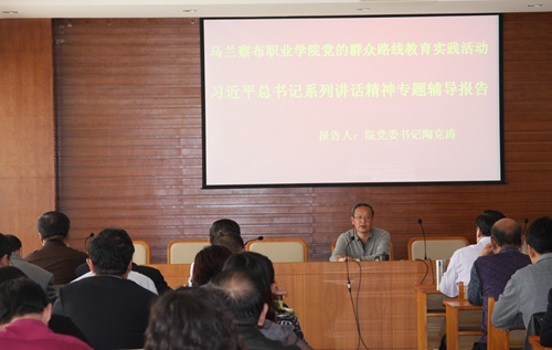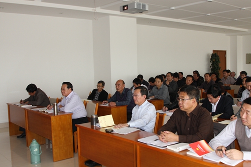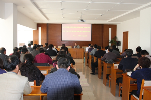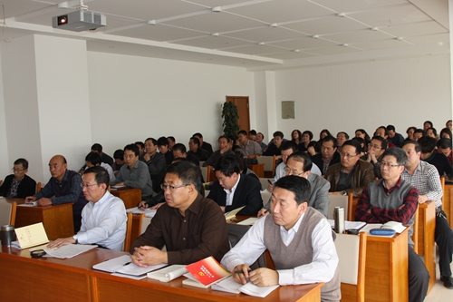 2014 年3月24日下午3点,在学院行政办公楼五楼会议室,院党委举行习近平总书记系列讲话精神专题报告会,报告会由学院党委副书记、院长张策同志主持,学院党政领导班子成员、副处级以上环节干部参加了报告会。院党委书记陶克涛同志以《抓住当代中国道路、旗帜、法宝、核心这四个重大问题,以四大关键词解读学习习近平总书记系列讲话精神》为题就习近平总书记的系列讲话精神做了专题辅导和解读。