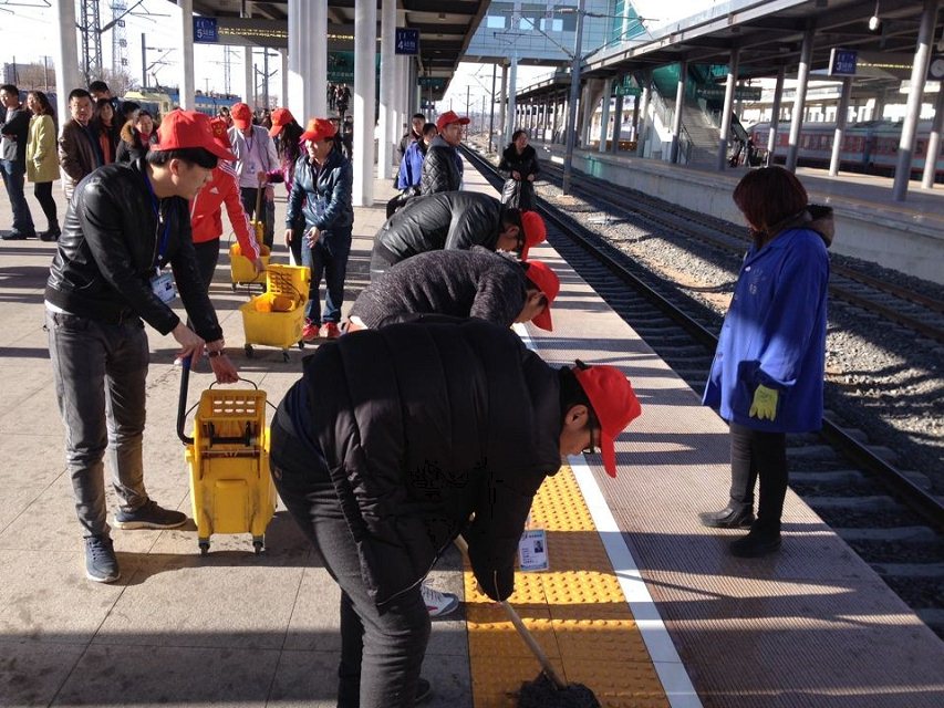 清扫火车站盲道的志愿者们