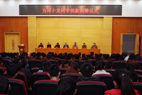 2013年11月6日下午4:30分,我院在行政楼学术报告厅举行为周小龙同学捐款捐赠仪式。我院党委副书记、纪委书记赵子平、党委委员、副院长方招祥、苏林鹏、孙成明、党委委员、教务处处长仇文君、党委委员、学生工作处处长逯全仓出席大会,周小龙同学的家长周志雄、刘小刚及我院党委宣传统战部、学生工作处、团委、生物技术系全体教师、各系部书记、主任、学工办主任、辅导员和各系部学生代表参加了捐赠仪式,捐赠仪式由逯全仓同志主持。