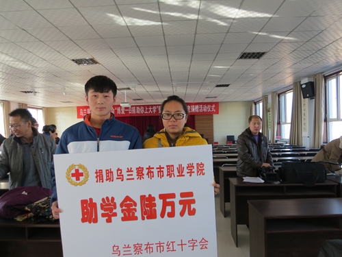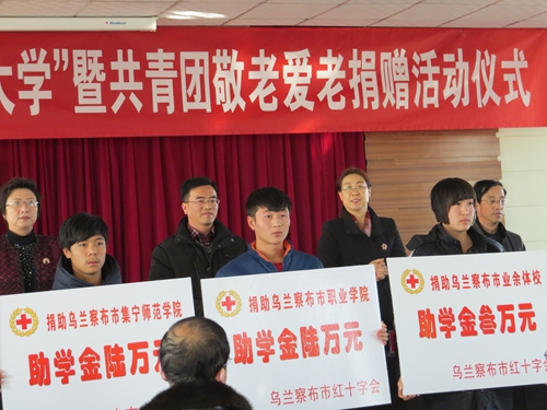 2013年11月29日上午10:30分,由乌兰察布市红十字会主办的 “博爱一日捐助你上大学”暨共青团敬老爱老捐赠活动仪式在集宁区虎山办事处六楼报告厅举行,乌兰察布市副市长王芳及相关领导、受助各学校负责人和学生代表参加了仪式。我院苏林鹏副院长、学生处孙爱玲副处长、学生处学生资助管理中心张亭立老师及学生代表参加了捐赠仪式。