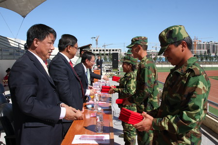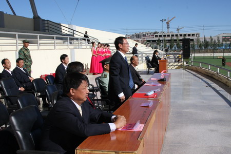 主席台上领导们满怀喜悦、热情洋溢,出席大会的领导有我院党委副书记 院长张策、承训部队首长及我院方招祥、苏林鹏、孙成明、秦喜四位副院长。上午9:00,大会准时开始,嘹亮的国歌响彻田径场,接着是庄严的阅兵式。“同学们辛苦了”,“首长好”,这一对一答间,展现着同学们的自信和报效祖国的真诚,也体现了领导对同学们艰苦训练、不懈追求的欣赏和勉励。接下来是分列式,三名旗手护着校旗,首先走过主席台,然后是以各系同学为主体的各个排。整齐的方阵、响亮的口号、矫健的步伐体现着军人的气质,挥洒着军人的风采。
