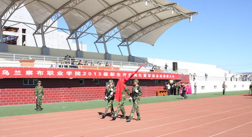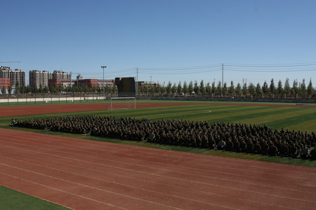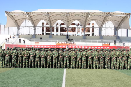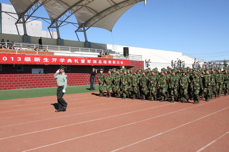 2013年9月14日,晴空万里、艳阳高照,一排排整齐的队伍精神抖擞的站在绿茵的田径场上,整装待发。今天是个好日子,今天我院将在田径场隆重举行2013级新生开学典礼暨军训总结表彰大会。为了这一天,我院2013级近2000名新同学冒着烈日、迎着风雨在田径场上,艰苦顽强的训练了14天。