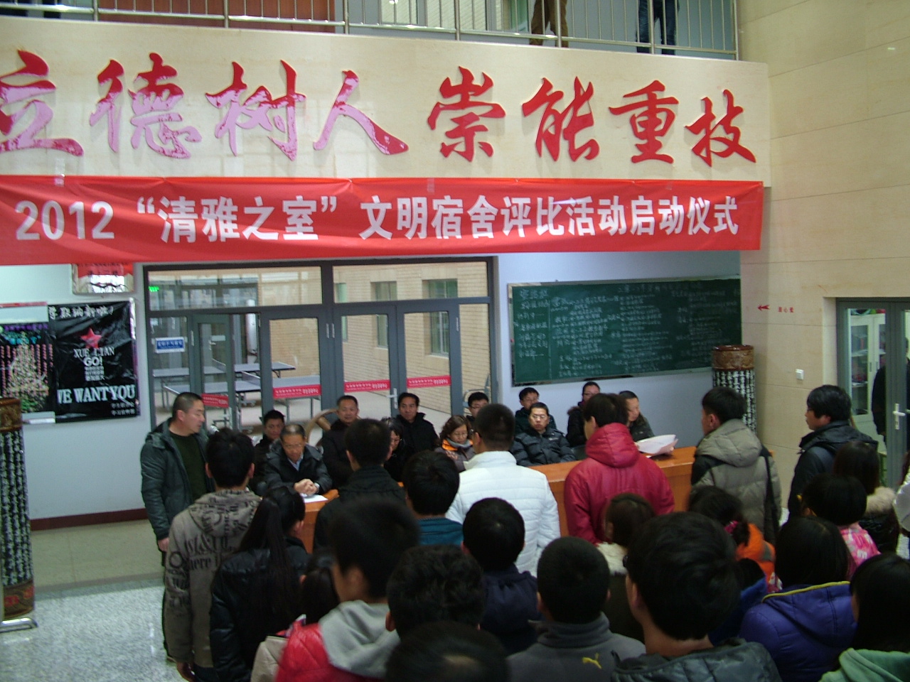 为营造良好的公寓文化氛围,促进学生公寓文化建设,提高公寓文化水平,2012年12月6日下午4:30分,我院在学生活动中心一楼启动了“清雅之室”宿舍文化评比活动。学生工作处副处长孙爱玲老师,公寓科段建宁老师,各系部副书记、学工办主任、辅导员、各系部学生会主席、学生会生活部长、学管会成员参加了启动仪式。