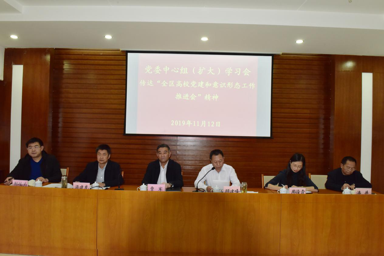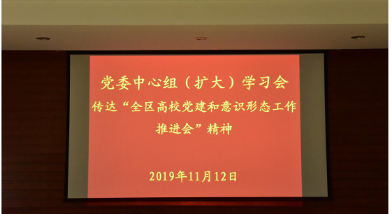 2019年11月12日,院党委在行政楼五楼会议室召开中心组(扩大)学习会议,传达“全区高校党建和意识形态工作推进会”精神。党委书记贾军,党委副书记、院长顾建峰,党委副书记、纪委书记梁建龙,党委委员、副院长周俊霞、郝伯为,党委委员、宣传部长潘井出席会议。各党总支、直属党支部书记、副书记,各基层党支部书记,全院副处级以上干部,党政办、组织统战部、宣传部、纪检处、团委全体人员参加学习。