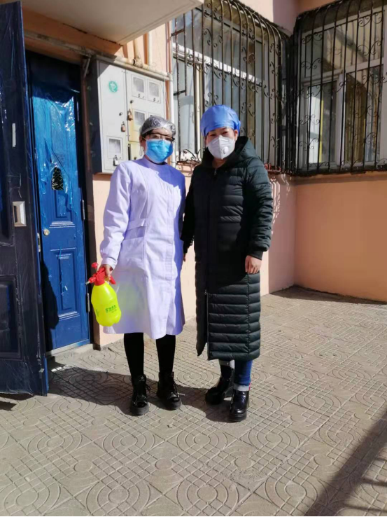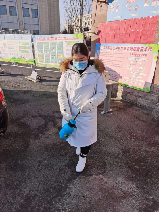 随着疫情的发展,防控工作任务不断增加,先后在学院北门和包联四处家属小区设立疫情防控体温检测点,斯琴亲自参与学院北门出入人员进行体温测试登记的同时又对各值班点如何使用测温枪、表面消毒及消毒液的调配、消杀等工作进行指导培训,她不定期去4个包联小区值守点进行工作指导并且一再告诉值守点的老师们一定要科学防控,做好个人防护,教大家七步洗手法等。作为医务室主任,斯琴同志从开始进入紧张的疫情防控工作后,就天天奔波在学院、市区防疫部门协调解决防护、消杀用品,指导专业工作,上报信息、张贴宣传展板等多项工作。市区公交停发,她又不会开车,同是我院职工的爱人就成了她的专职司机,每天默默接送着妻子做着疫情防控工作,有时还帮助运送物品、临时值班。 特别是1月30日,斯琴主任在全院公共区域指导消杀工作时,不慎在教学楼门口脚扭伤,脚腕肿痛难忍,但她咬着牙忍着没有休息,一直坚持完成工作。
