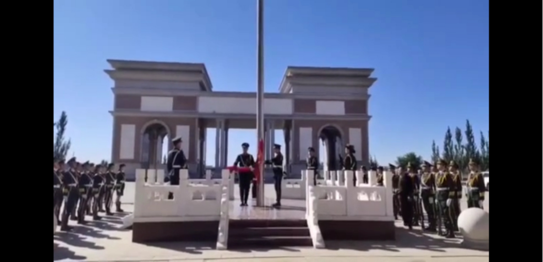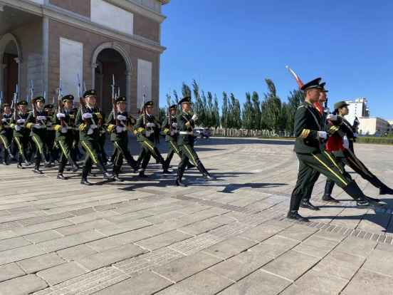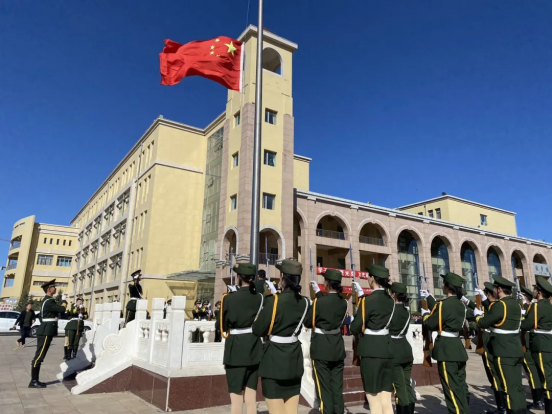 首先进行第一项升旗仪式,全体人员整齐列队、庄严而立,国旗护卫队迈着整齐的步伐,护送国旗正步走向升旗台。擎旗手接旗,解旗,展旗每一个动作坚定有力。伴随着庄严雄壮的国歌声,现场人员肃立起敬,与会人员一起高唱国歌,展现出新时代乌职院师生积极向上的良好风貌和深切的爱国情怀。
