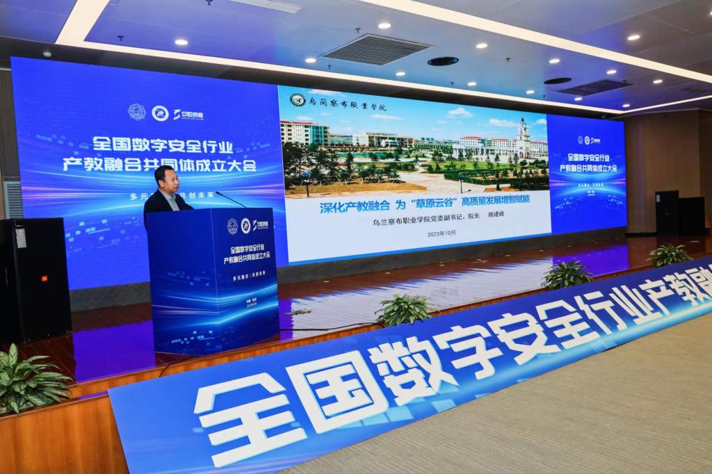 10月20-21日,在工业和信息化部教育与考试中心、全国工业和信息化职业教育教学指导委员会指导下,安恒信息、西安电子科技大学和杭州职业技术学院共同发起成立的全国数字安全行业产教融合共同体成立大会在杭州隆重举行。全国普通高校、职业院校和龙头企业等252家单位参加会议。我院作为副理事长单位受邀出席会议,学院党委副书记、院长顾建峰作了“深化产教融合,为"草原云谷"高质量发展增智赋能”的主题发言。