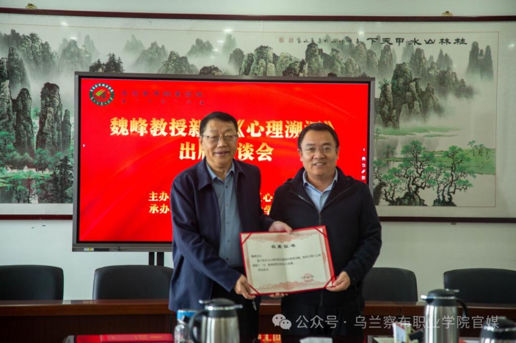 最后,内蒙古自治区心理学会向我院图书馆捐赠了图书。魏峰教授也将自己的新作《心理溯源》捐赠给学院图书馆,白永平副院长为魏峰教授颁发收藏证书。