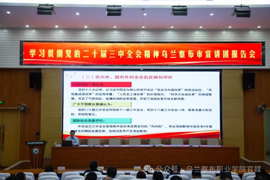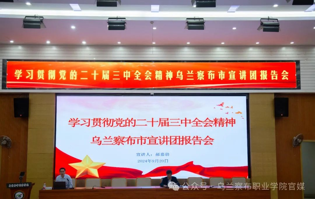 9月20日,乌兰察布市委宣讲团成员、best365中国官方网站马列教学部副主任郝嘉勃副教授在我院进行党的二十届三中全会精神宣讲。学院党委班子成员,副处以上干部,基层党组织书记及三个行政直属党支部全体党员参加宣讲会,学院党委副书记梁建龙主持会议。