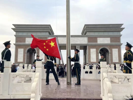一抹华夏红,万千爱国情,国旗护卫队的队员们迈着整齐划一的步伐,护送着鲜艳的五星红旗入场,在激昂的国歌声中,五星红旗在朝阳的映衬下缓缓升起,全体学生面向国旗肃然而立,目光如炬,心中涌起无限的崇敬和自豪。
