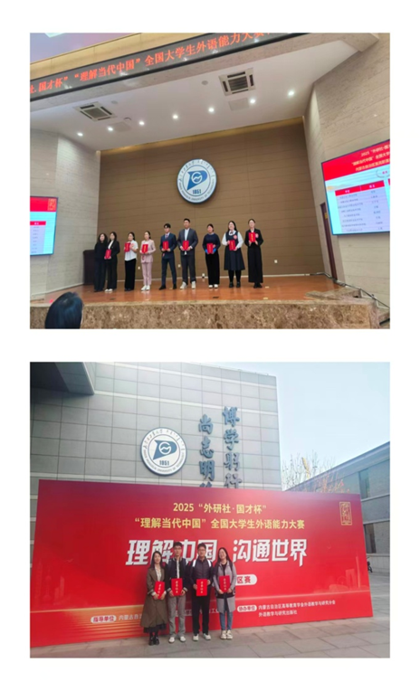 2025年11月1日,由内蒙古自治区教育厅主办的2025年“外研社·国才杯”“理解当代中国”全国大学生外语能力大赛内蒙古自治区赛在内蒙古工业大学成功举办。在综合能力教学部刘丽霞、苏日娜、王亚娜老师的精心指导和带领下,选派参赛的六名学子在英语组高职综合能力大赛与演讲大赛两个赛项中均发挥出色,从全区众多高校的佼佼者中脱颖而出取得了骄人战绩,为学院赢得了崇高荣誉!