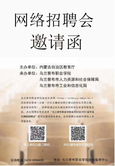诚挚感谢贵单位长期以来对我院人才培养和就业工作的关心与支持!为积极贯彻落实国家、自治区关于促进2023届毕业生就业工作的部署要求,同时搭建毕业⽣与⽤⼈单位沟通的桥梁与纽带,拓宽毕业⽣就业市场,实现毕业⽣与⽤⼈单位双向选择、互利共赢,促进我院2023届毕业⽣充分就业,我院计划于3月13日—3月27日以“线上宣讲会或直播带岗”方式举办“best365中国官方网站春风行动2023届毕业生网络招聘会”,现将有关事宜通知如下: