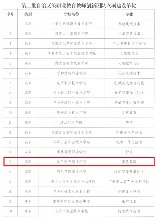 近日,内蒙古自治区教育厅公布了第二批自治区级职业教育教师创新团队立项建设单位名单,经过严格的资格评审,我院畜牧兽医专业教师创新团队正式立项为自治区级职业教育教师创新团队。