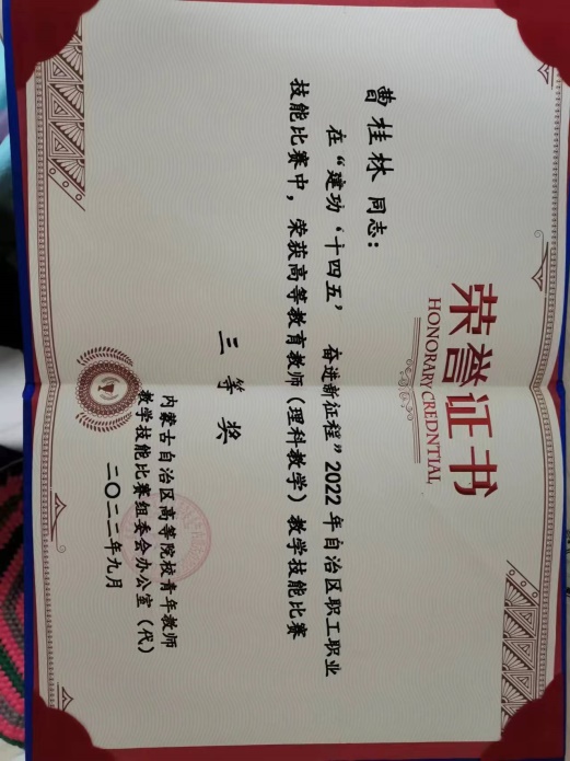 2022年7月,曹桂林获第十二届内蒙古自治区高等院校青年教师教学技能比赛三等奖。