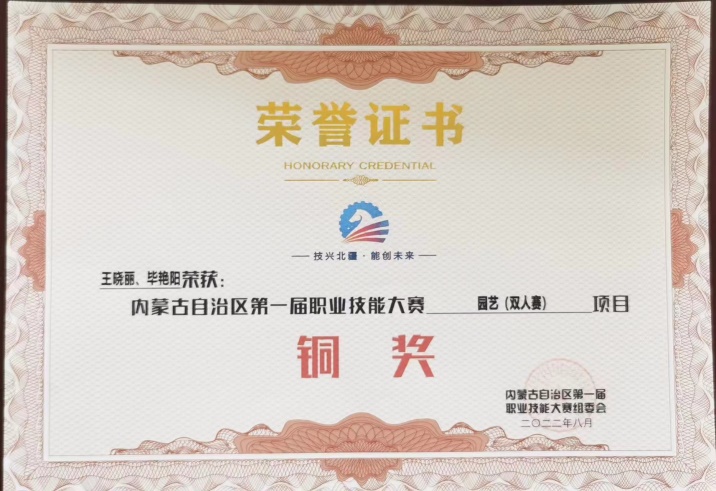 2022年9月,王晓丽、毕艳阳获内蒙古自治区第一届职业技能大赛园艺项目铜奖,指导老师为李晨晖和李向应。