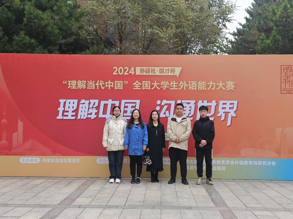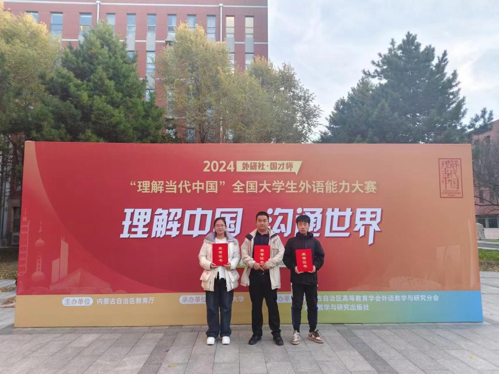 在 2024年11月2日在呼和浩特举行的2024“理解当代中国”全国大学生外语能力大赛的舞台上,我院学子大放异彩,展现出了卓越的外语素养和对当代中国深刻的理解。在综合能力教学部辅导老师刘丽霞,苏日娜,王亚娜的精心指导下,他们一路披荆斩棘,载誉而归。